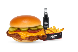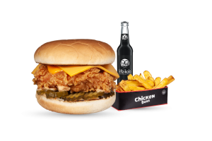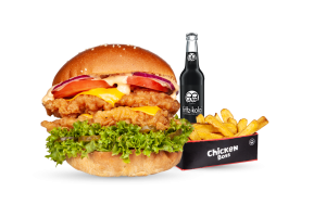• Burger mit 2 panierten Hähnchenbrustfilets, doppeltem Cheddar, Salat, Gurken, roten Zwiebeln, Boss-Spezialsauce und Käsesauce • 1 Beilage nach Wahl • 1 alkoholfreies Getränk 0,33l nach Wahl zzgl. Pfand