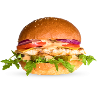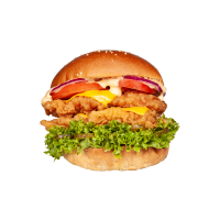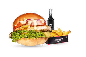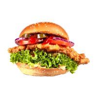 • Burger mit paniertem Hähnchenbrustfilet, Salat, Gurken, roten Zwiebeln und Mayonnaise • 1 Beilage nach Wahl • 1 alkoholfreies Getränk 0,33l nach Wahl zzgl. Pfand