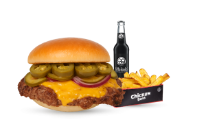 • Burger mit paniertem Hähnchenbrustfilet, Gurken, Salat, roten Zwiebeln, Jalapenos, Boss-Spezialsauce und Salsasauce • 1 Beilage nach Wahl • 1 alkoholfreies Getränk 0,33l nach Wahl zzgl. Pfand