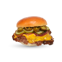 mit Smash Beef Pattie, Cheddar, Gurke, gebratene rote Zwiebel, Jalapeños und Specialsauce