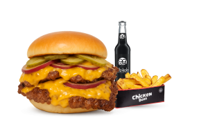 • Burger mit 2 panierten Hähnchenbrustfilets, doppeltem Cheddar, Salat, Gurken, roten Zwiebeln, Boss-Spezialsauce und Käsesauce • 1 Beilage nach Wahl • 1 alkoholfreies Getränk 0,33l nach Wahl zzgl. Pfand