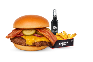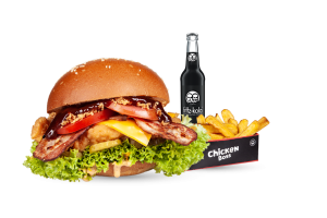 • Burger mit gegrilltem Hähnchenbrustfilet, Cheddar, Rucola, Gurken, roten Zwiebeln und Boss-Spezialsauce • 1 Beilage nach Wahl • 1 alkoholfreies Getränk 0,33l nach Wahl zzgl. Pfand