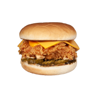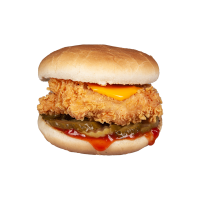 mit 2 panierten Hähnchenbrustfilets, doppeltem Cheddar, Salat, Gurken, roten Zwiebeln, Boss-Spezialsauce und Käsesauce