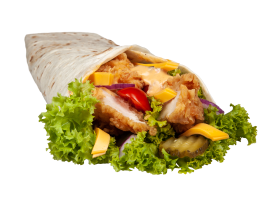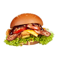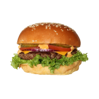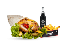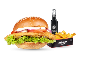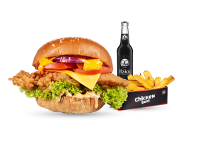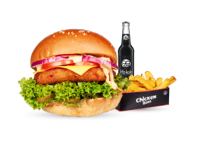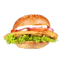• Burger mit paniertem Hähnchenbrustfilet, Salat, Gurken, roten Zwiebeln und Mayonnaise • 1 Beilage nach Wahl • 1 alkoholfreies Getränk 0,33l nach Wahl zzgl. Pfand
