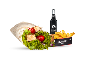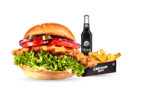 • Burger mit paniertem Hähnchenbrustfilet, Gurken, Salat, roten Zwiebeln, Jalapenos, Boss-Spezialsauce und Salsasauce • 1 Beilage nach Wahl • 1 alkoholfreies Getränk 0,33l nach Wahl zzgl. Pfand