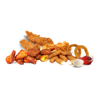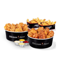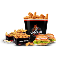 • 18 Hot-Wings • 6 Filet Bites • 4 Fried Chicken-Bucket • 3 Pommes frites • 4 Saucen nach Wahl