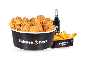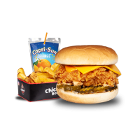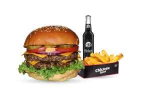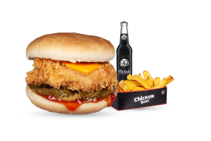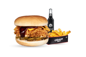 • Burger mit 2 panierten Hähnchenbrustfilets, doppeltem Cheddar, Salat, Gurken, roten Zwiebeln, Boss-Spezialsauce und Käsesauce • 1 Beilage nach Wahl • 1 alkoholfreies Getränk 0,33l nach Wahl zzgl. Pfand