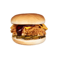 mit 2 panierten Hähnchenbrustfilets, doppeltem Cheddar, Salat, Gurken, roten Zwiebeln, Boss-Spezialsauce und Käsesauce